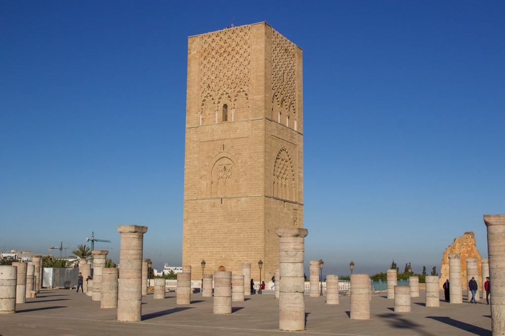 Right outside of the mausoleum is Hassan Tower, which is a famous minaret (i.e., the part of a mosque where the muezzin calls Muslims to prayer).