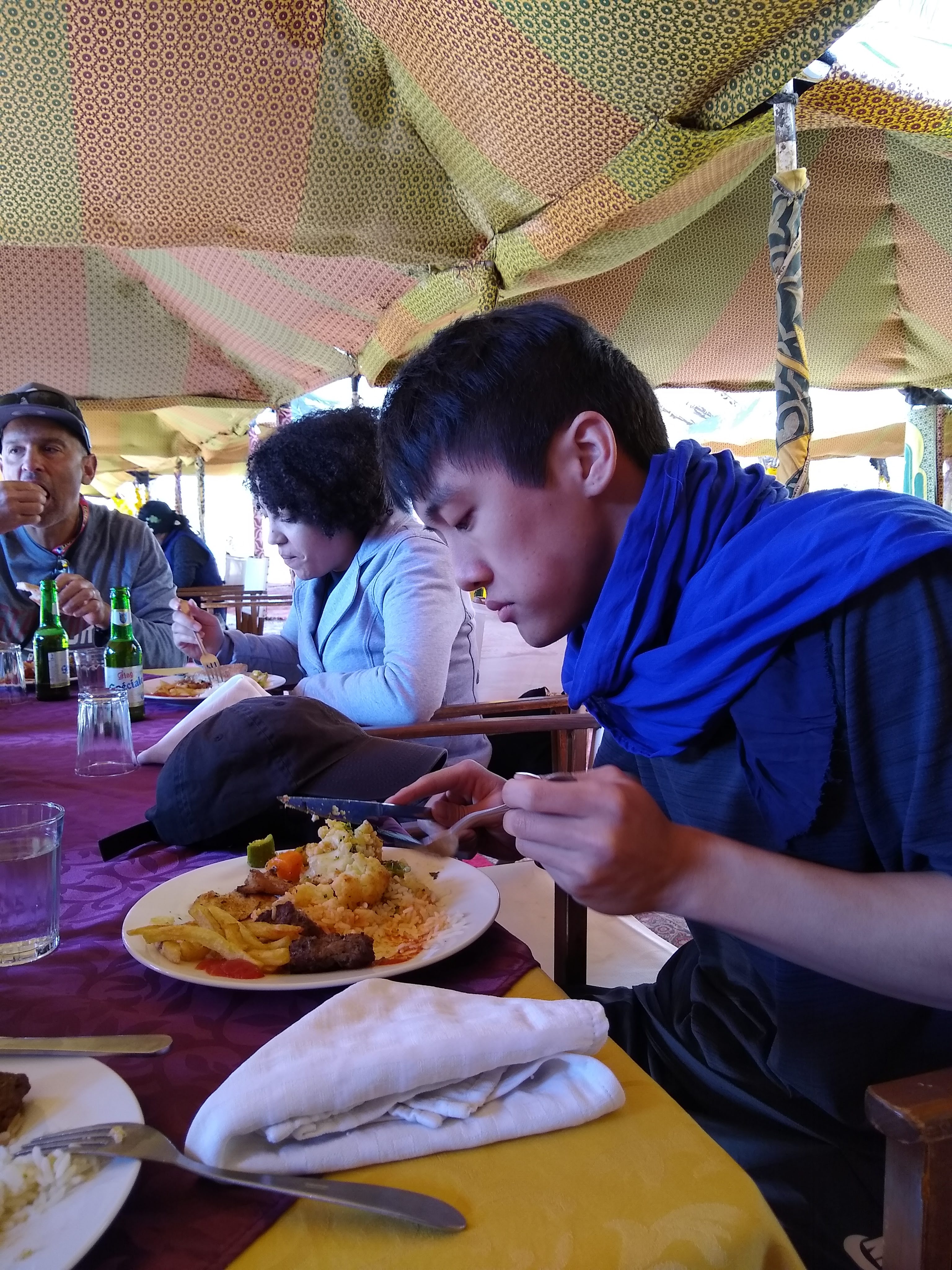 We all rode the tour bus back to the hotel around noon. My mom and I (along with a few other people in our tour group) took a day trip out to the Sahara desert, while other stayed behind at the hotel. We had lunch (which didn’t taste that great) in tents by the desert. Then, we were driven out into the desert in SUVs.